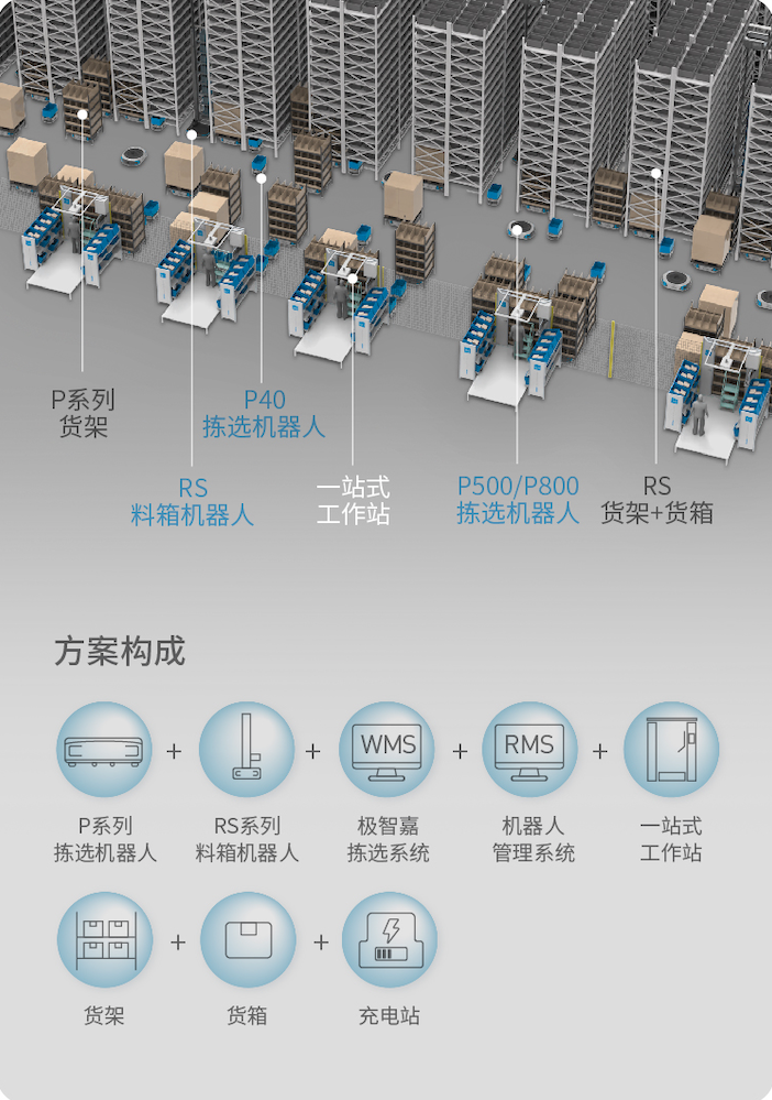 P40和P500/P800均搬运料箱和货架至同一工作站停靠点,让拣选员在一个拣选点即可完成大中小件的混合拣选。