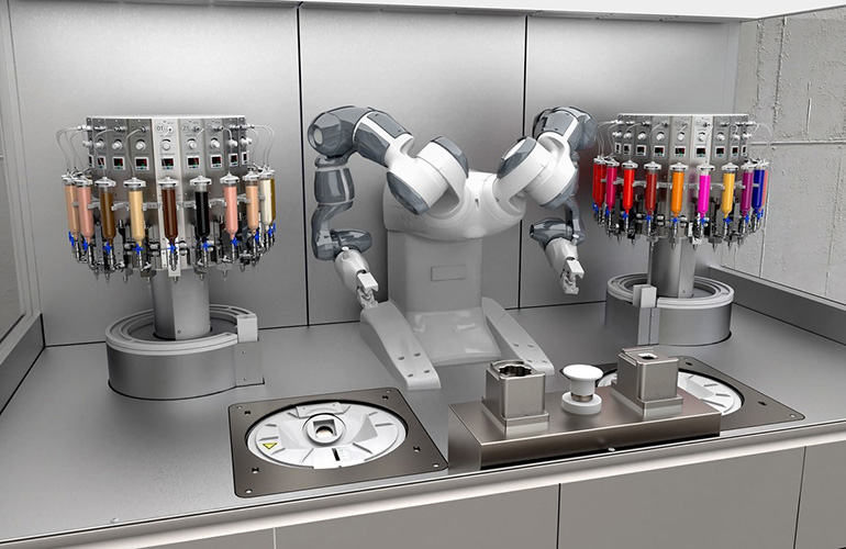 韩国美容产品供应商AmorePacific推出了名为 Authentic Color Master by Tonework 的全新化妆品系列。化妆品的制造是为了满足每个客户的需求。Tonework 使用 AI 算法来精确分析面部色调。然后,它使用机器人技术制作定制粉底液、气垫粉底和唇部产品。系统使用双臂 ABB YUMi 机器人为每个客户自动混合和制作定制化妆品。
