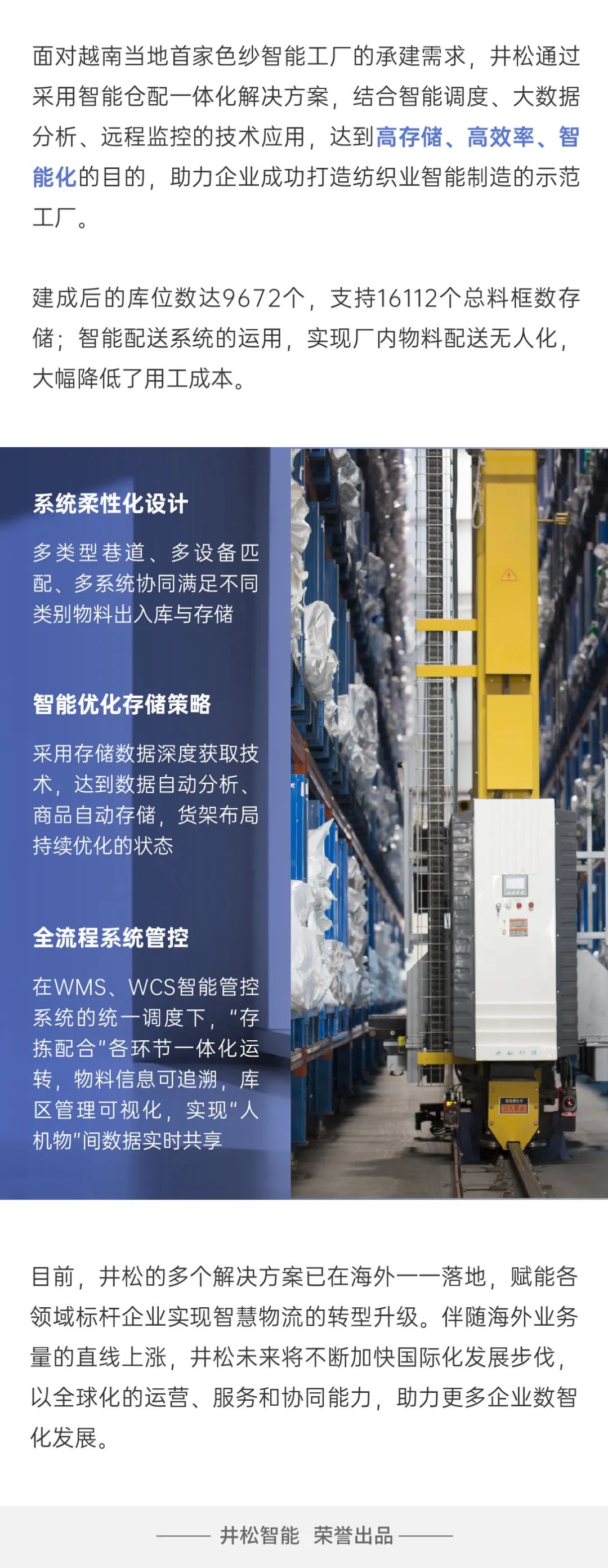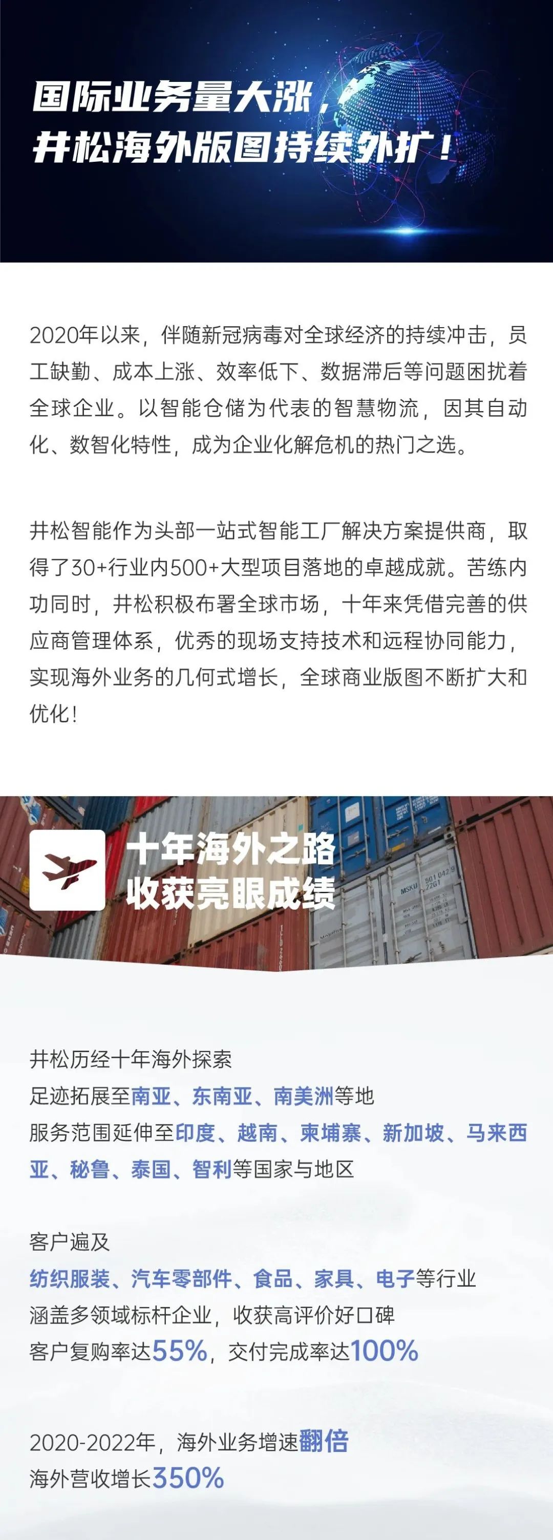 井松成立于2007年,是国内领先的智能物流系统集成商与物流装备制造商,主要从事自动化立体仓库及企业内物料输送系统等软硬件系统的研究开发、规划设计、安装实施与技术服务等。