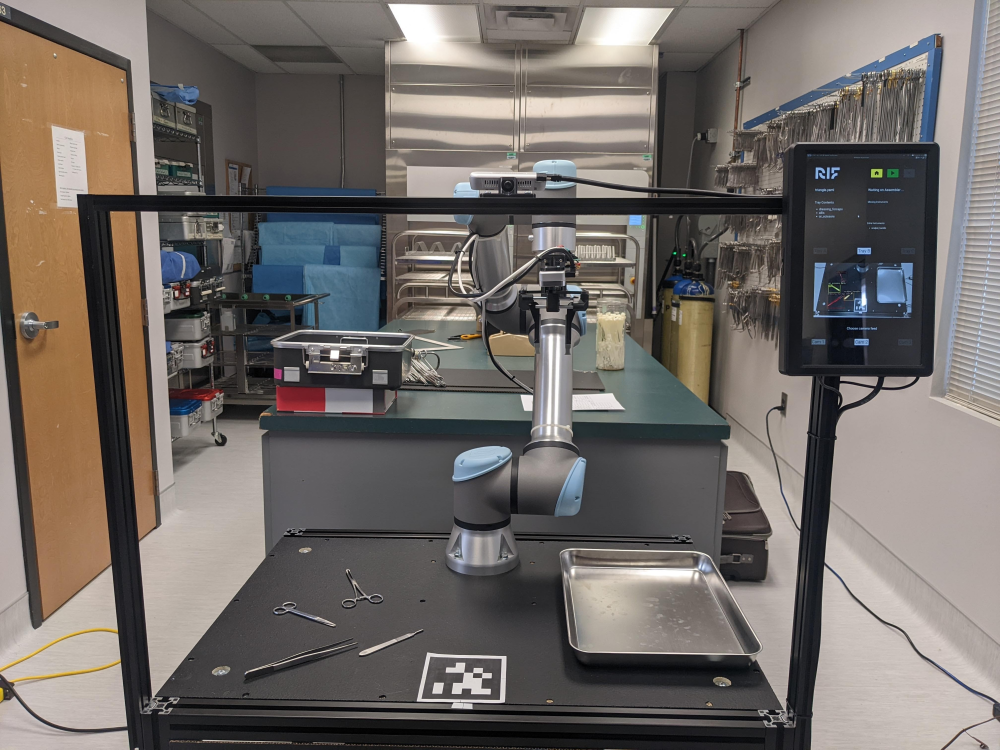RIF并没有解决清洁问题。但这家初创公司声称,它的原型产品在不到两个月的时间内开发完成,可以通过识别、分类和操作四种不同的仪器以及组装一个小型手术盘来节省外科医生的时间。两个机器学习系统--一个图像分割系统和一个物体分类器,在手术工具的真实和合成图像集上进行训练--帮助机器人操纵臂抓取和移动这些工具。