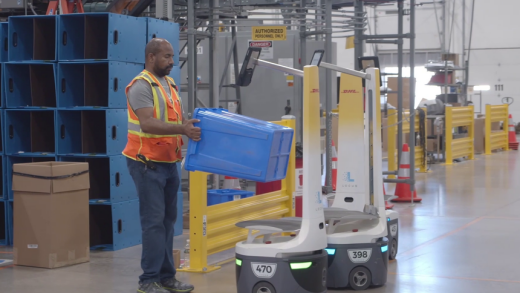 一名 DHL 员工在 DHL 工厂使用 Locus Robotics 的机器人。