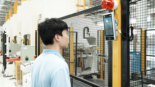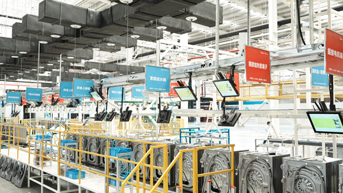 白色的冲压设备通过轨道机串联起来,完成一站式的切割、钻孔和冲压,不需要人工操作。当集装箱通过履带机向前移动到一个固定的目的地时,提升机迅速上升,将集装箱运送到装配车间。得益于5G,在这个工厂里,每15秒就有一台洗衣机从生产线上下来,而在不久的将来,这个数字将减少到10。