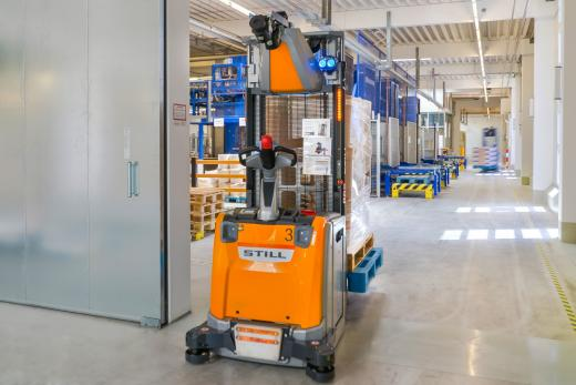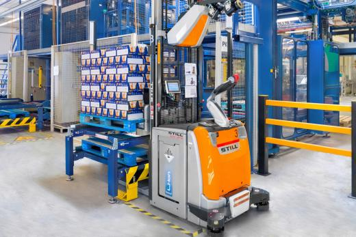 AGV的任务是多方面的。一方面,它们将原材料和包装物运送到生产地。另一方面,自动化的EXV高架车接管了可回收物的处理和空托盘的运送。STILL项目经理Thomas Rothbauer:"如果生产部门在SAP主机中报告了需求,就会在'仓库'的辊道系统中触发一个运输订单。输送机的感应式传感器控制AGV。有了优先权,AGV就能识别出哪个辊道必须首先得到服务。”