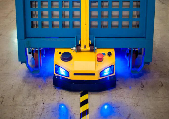 在光学方法中,路径被涂上与地板其余部分具有不同对比度的颜色。车辆上的摄像头不断监控主线的路线,从而可以确定 AGV 相对于路径的位置。与磁环一样,粘在地板上或涂在地板上的线条也需要不时更新。