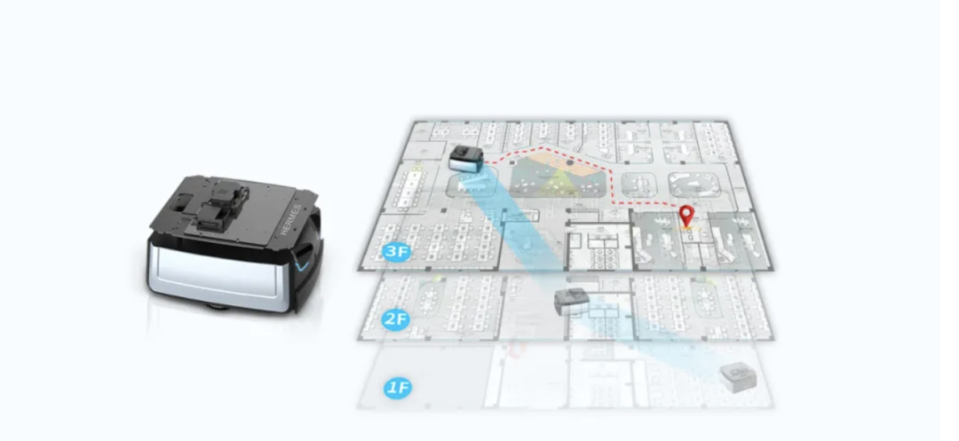 Hermes赫尔墨斯底盘的出现,让机器人一下子具备了多楼层移动的能力。不仅形成了机器人从“平面”空间到“垂直”空间应用的突破,还为赋能更多元化的场景铺平了道路。