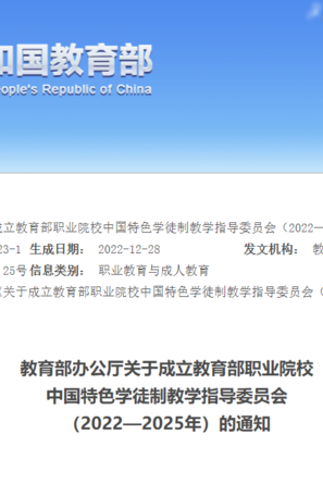 近日,据教育部官网显示,教育部办公厅《关于成立教育部职业院校中国特色学徒制教学指导委员会(2022—2025年)》的通知,其中表示为落实新修订的职业教育法,经研究决定,在教育部职业院校教学(教育)指导委员会中增设“中国特色学徒制教学指导委员会”。