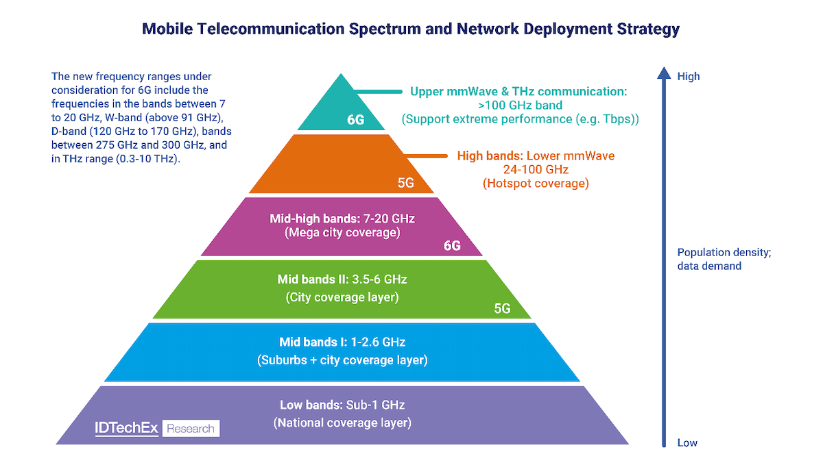 6G频谱部署战略概述。请注意,尽管根据定义,太赫兹频段从300GHz到10THz,但电信专业人士发现将超过100GHz的应用归为太赫兹通信更为简单。
