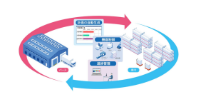 一个例子是通过连接 AGV(自动引导车辆)和自动化仓库来实现“生产、运输、库存管理和运输的自动化”。在制造基地,AGV在生产线出口设置小车,当产品装上小车后,随小车一起运送到自动化仓库。同样,在运输过程中,自动化仓库和AGV协同工作,将产品运送到指定地点。