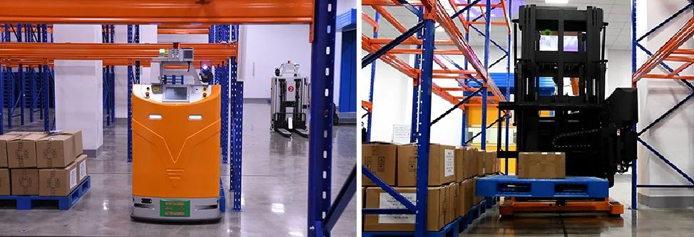 窄巷道三向叉机器人在巷道内采用磁导航,外部区域采用激光导航