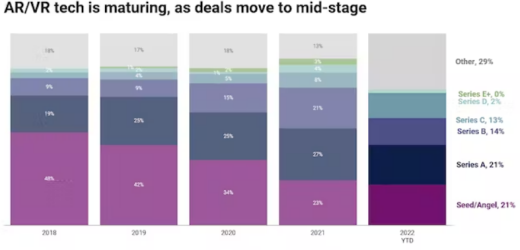 AR/VR 设备市场相对较新,许多初创公司都在争夺份额。另一方面,该领域对中后期公司的投资比例正在上升,呈现出成熟迹象。