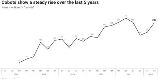 协作机器人在过去五年中呈上升趋势(新闻中提及“协作机器人”的次数)