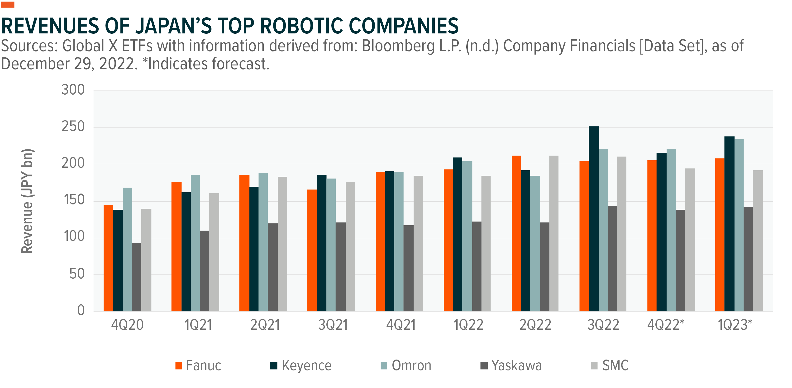 在对机器人和工厂自动化的持续强劲需求的支持下,机器人公司的销售和盈利依然稳健。如果我们看一下一些顶级的日本机器人公司,包括Fanuc、Keyence、Omron、Yaskawa和SMC,它们在2022年第四季度和2023年第一季度的平均收入同比增长率分别为11.8%和11.0%。