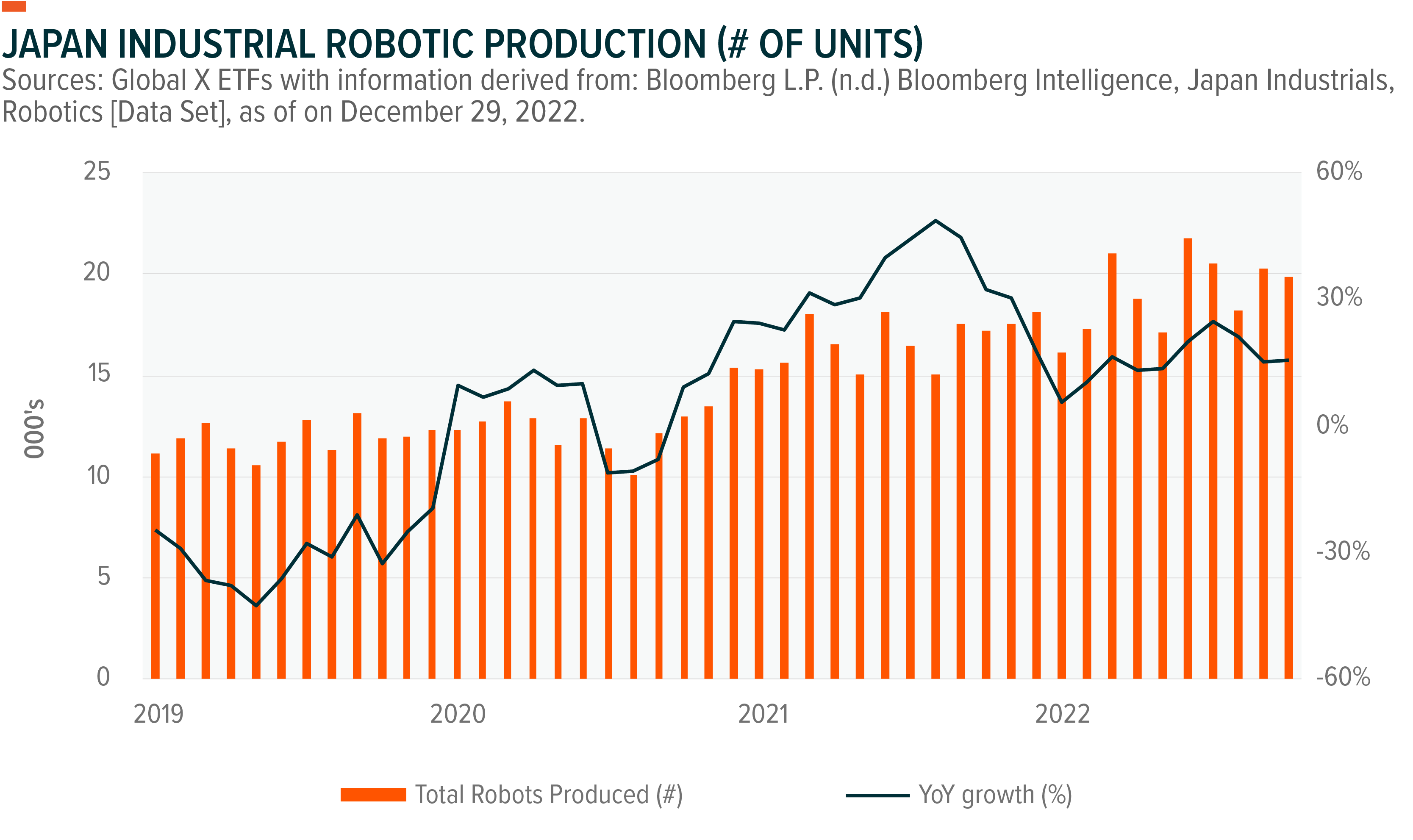历史告诉我们,我们可以从日本和中国来衡量工业机器人和自动化的前景,我们预计2023年也是如此。由于关键数据点继续显示出优势,行业动态支持那些对机器人主题有强烈兴趣的公司。全球工业机器人的生产和销售保持了最近的积极增长轨迹,并得到了日本半导体账单的创纪录水平的支持。鉴于中国电气机械和设备的出口值有些疲软,这些趋势更加突出,我们预计随着中国的重新开放,这种疲软将在2023年扭转。宏观经济环境可能在短期内对工业机器人技术构成挑战,但在我们看来,企业对自动化的驱动力显然是存在的。