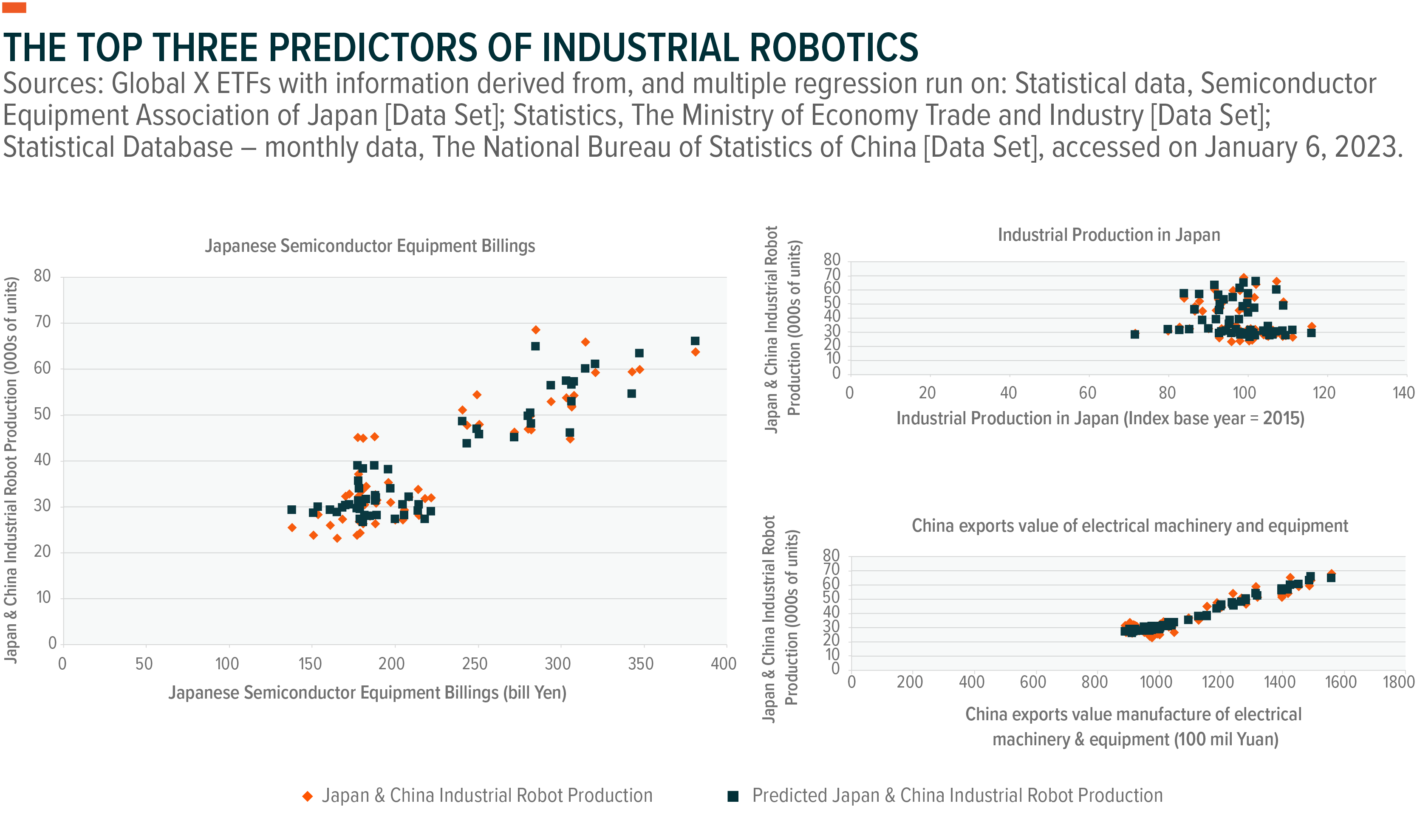 对这三个因素与日本和中国工业机器人生产的多元回归分析产生的决定系数,也称为R^2,为91%。决定系数可以被理解为一个模型的拟合度。从本质上讲,它揭示了自变量所能解释的因变量的变化比例。在这种情况下,因变量是工业生产,自变量是三个因素。R^2为100%,意味着所有的变化都可以由模型的输入来解释。因此,R^2为91%意味着所考虑的因素是日本和中国工业机器人生产的有力预测因素,我们将其视为全球工业机器人生产的代表。