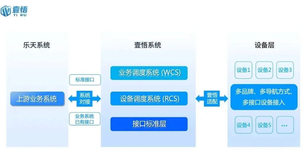 壹悟科技的软件产品向上对接客户业务系统,做到保证订单数据的快速有效下发的同时做好数据的保密工作,保障企业的数据安全。依靠壹悟科技自行研发的多机器人协同技术,设备层可接入多品牌、多导航方式、多接口的移动机器人和自动化设备,具有轻量级、易部署、易运维的特点,帮助客户打造适合自身业务场景的最优解决方案。