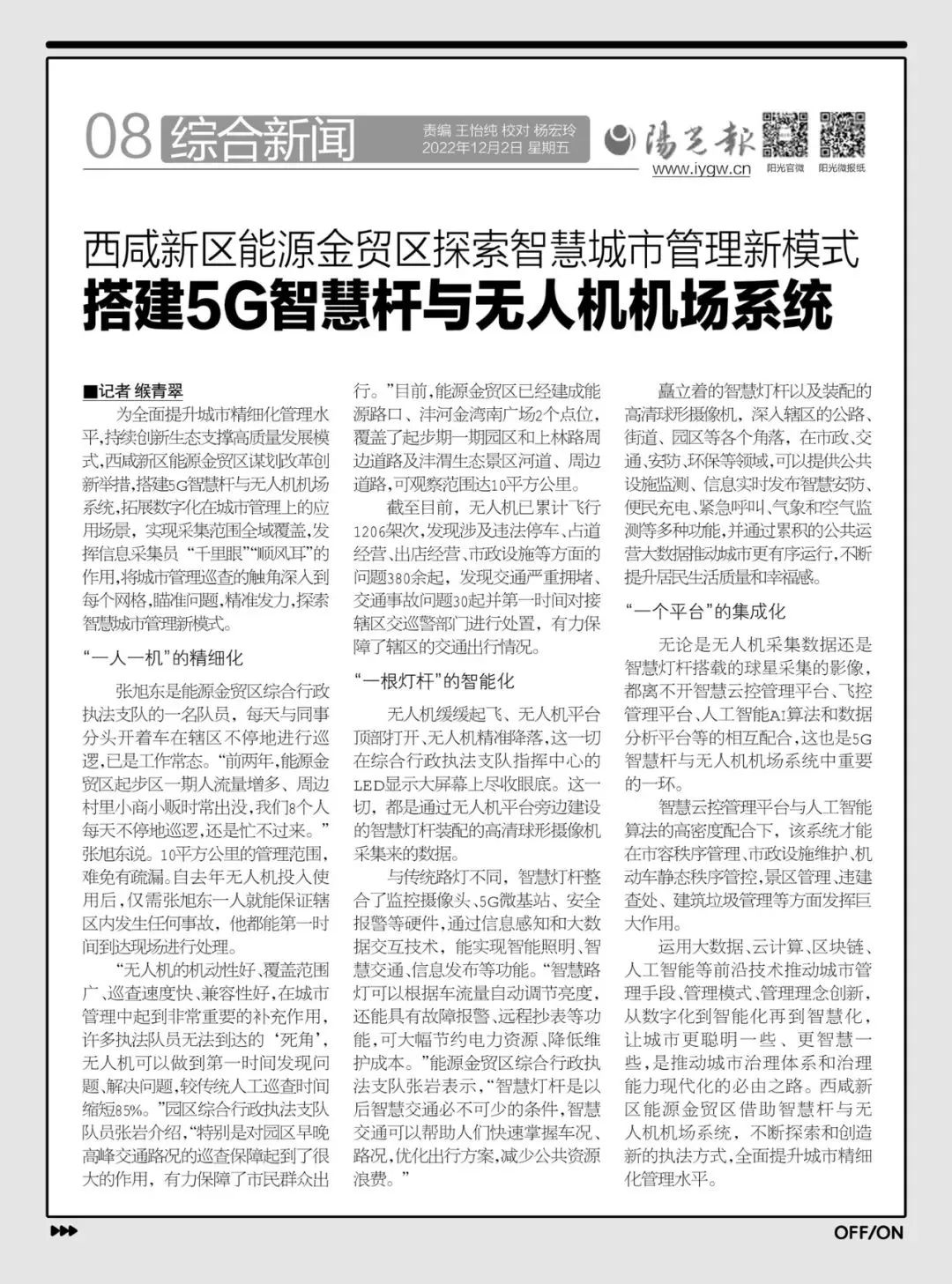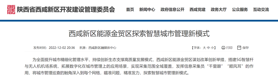 为全面提升城市精细化管理水平,持续创新生态支撑高质量发展模式,西咸新区能源金贸区谋划改革创新举措,搭建首套5G智慧杆与无人机机场系统,拓展数字化在城市管理上的应用场景,实现采集范围全域覆盖,发挥信息采集员‘千里眼’‘顺风耳’的作用,将城市管理巡查的触角深入到每个网格,瞄准问题,精准发力,探索智慧城市管理新模式。