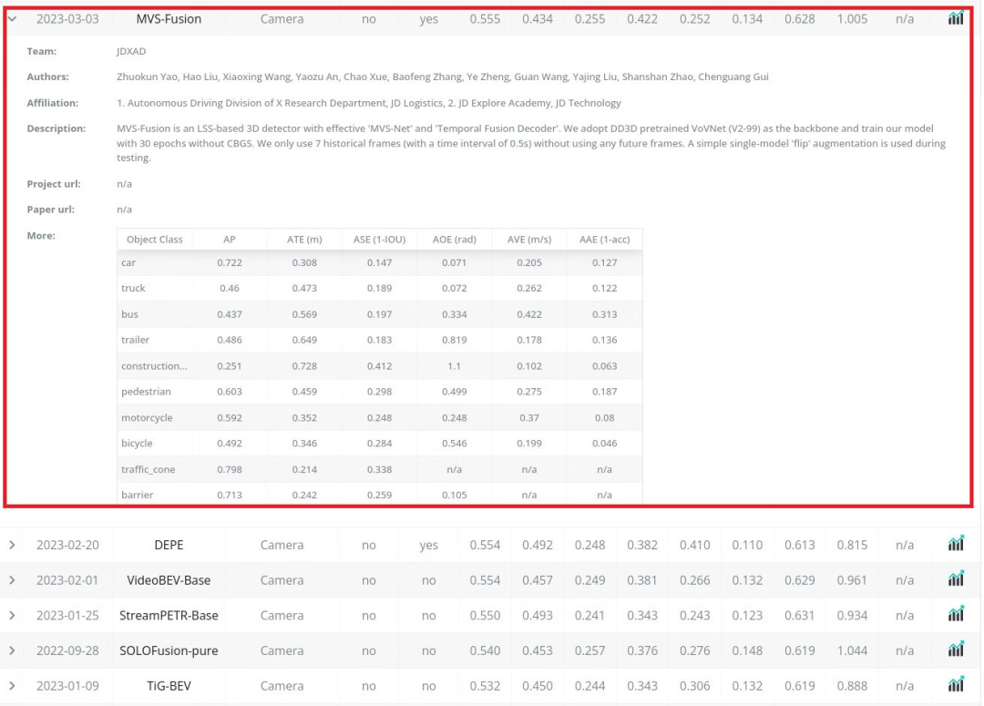 近日,京东物流X业务部联合京东探索研究院自研算法“MVS-Fusion”通过纯视觉3D目标检测,以高达55.54%的mAP(平均精度均值)在不使用未来帧数据的算法中,登顶国际权威自动驾驶视觉算法榜单nuScenes,超越众多国内外知名公司及顶尖科研机构。这是继去年京东物流智能驾驶团队提出的前融合算法“PAI3D”荣登榜首后,首次在纯视觉领域获得第一。