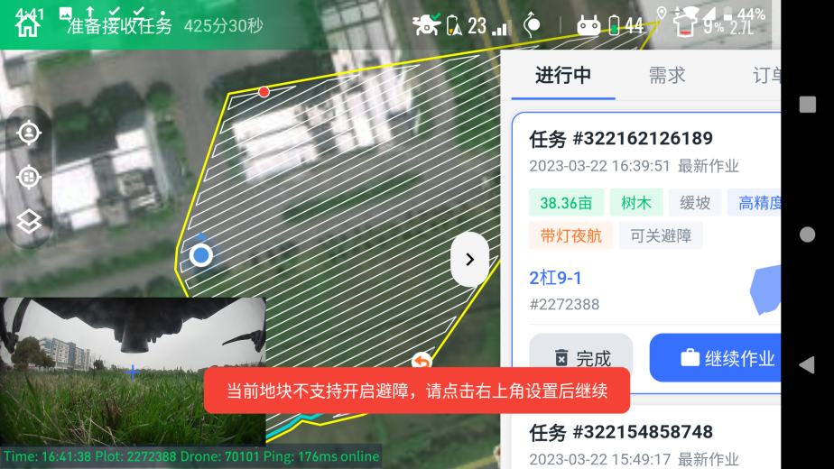 当选择的地块类型为树木时,无人机开启避障无法进行作业,为方便用户及时知晓,加入语音提示——“当前地块不支持开启避障”。