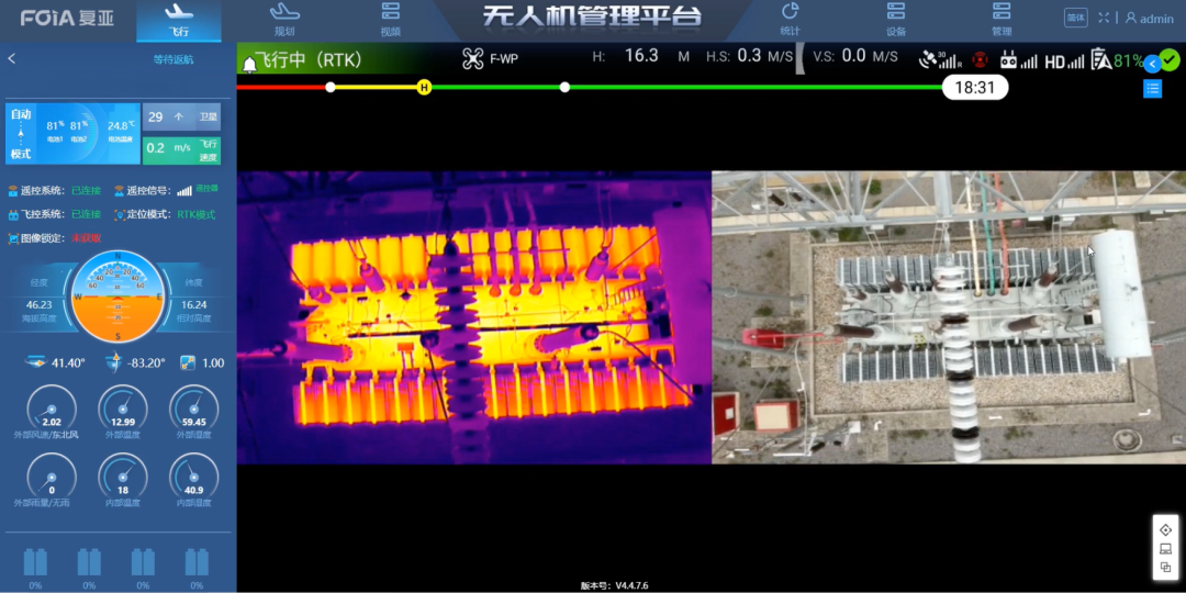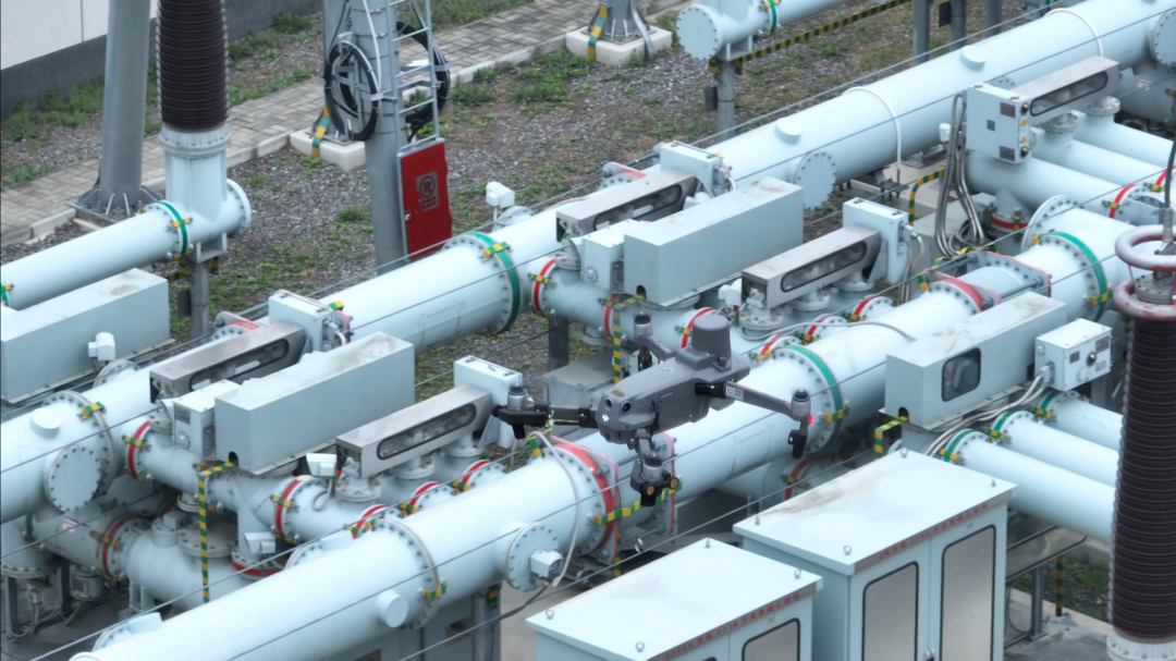 由无人机、无人机载荷、机载AI智能飞行大脑、自动化无人机机场等设备组成的变电站无人机全自动巡检系统部署在国网安徽变电站内,通过管控平台指挥,无人机在自动机场中一键起飞,搭载双光相机完成变电站内设备自动巡检作业,巡检视频实时回传,红外视角辅助判断有效发现隐患和缺陷,巡视结束后生成包含位置信息的巡检报告,完成高效、高质量巡检。另外无人机巡检对变电站内和周边安防监控进行有效补充,为一线班组减负。