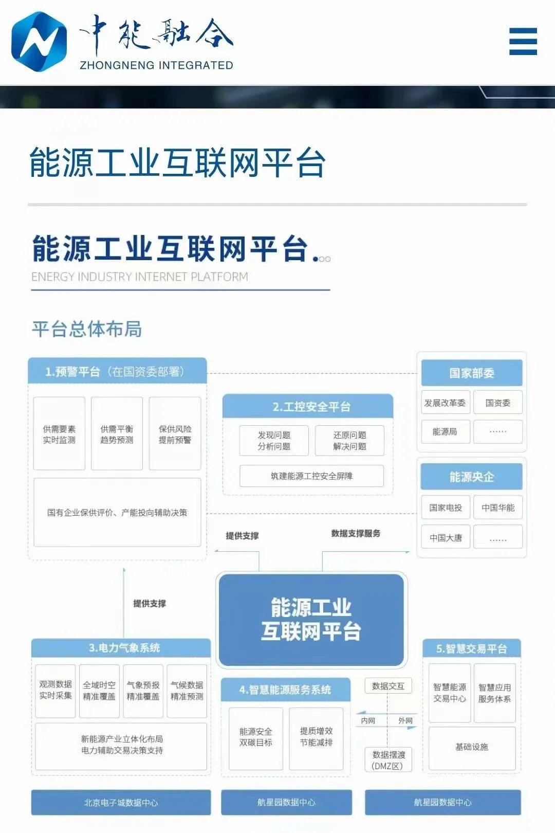 中能融合是在国务院国资委指导及有关部委共同推动下,由国家电力投资集团有限公司联合14家国有能源企业和1家民营高科技企业共同出资组建而成。其以“建设能源工业互联网平台,让能源更安全更智慧”为企业使命,开展服务国家能源安全和能源智慧发展。