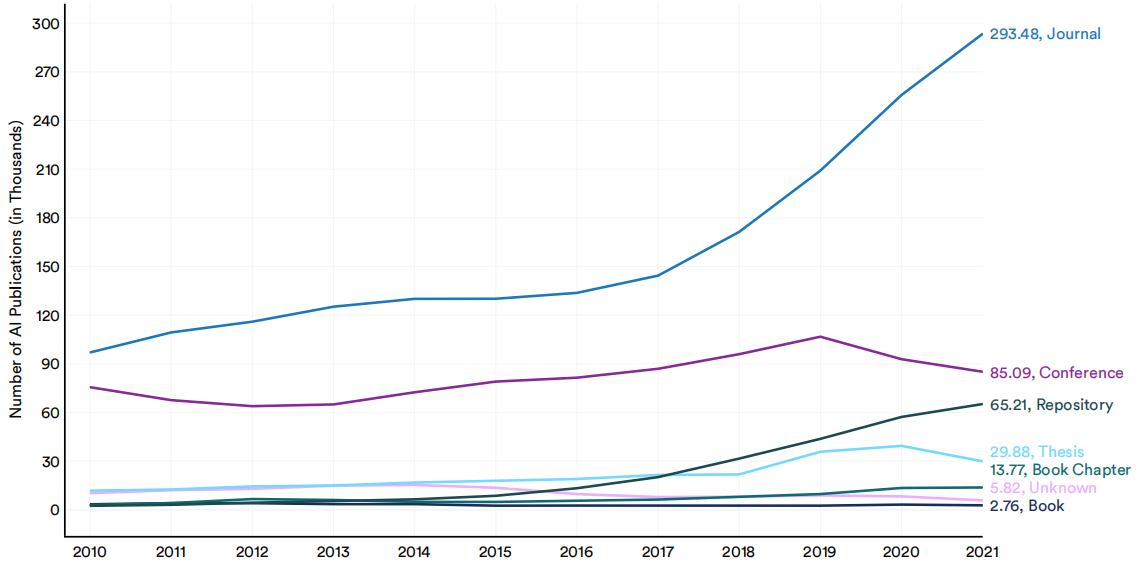 图 1.1.2 显示了随着时间的推移全球发布的人工智能出版物的类型。2021 年,所有已发表的 AI 文档中有 60% 是期刊文章,17% 是会议论文,13% 是存储库提交。书籍、书籍章节、论文和未知文档类型”构成了其余 10% 的出版物。虽然在过去 12 年中,期刊和知识库出版物分别增长了 3 倍和 26.6 倍,但会议论文的数量自 2019 年以来有所下降。