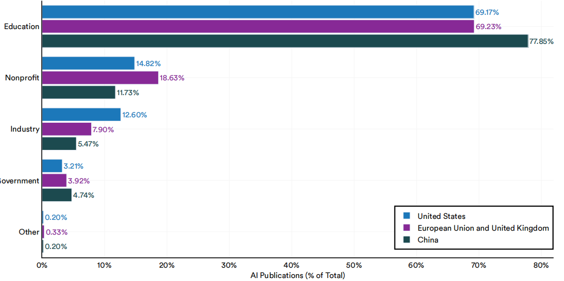本部分显示了隶属于教育、政府、工业、非营利组织和其他部门的人工智能出版物的数量——首先是全球(图1.1.4),然后是美国、中国、欧盟和英国(图1.1.5)。教育部门在每个地区占主导地位。行业参与水平在美国最高,然后是在欧盟。自2010年以来,人工智能出版物的份额一直在下降。