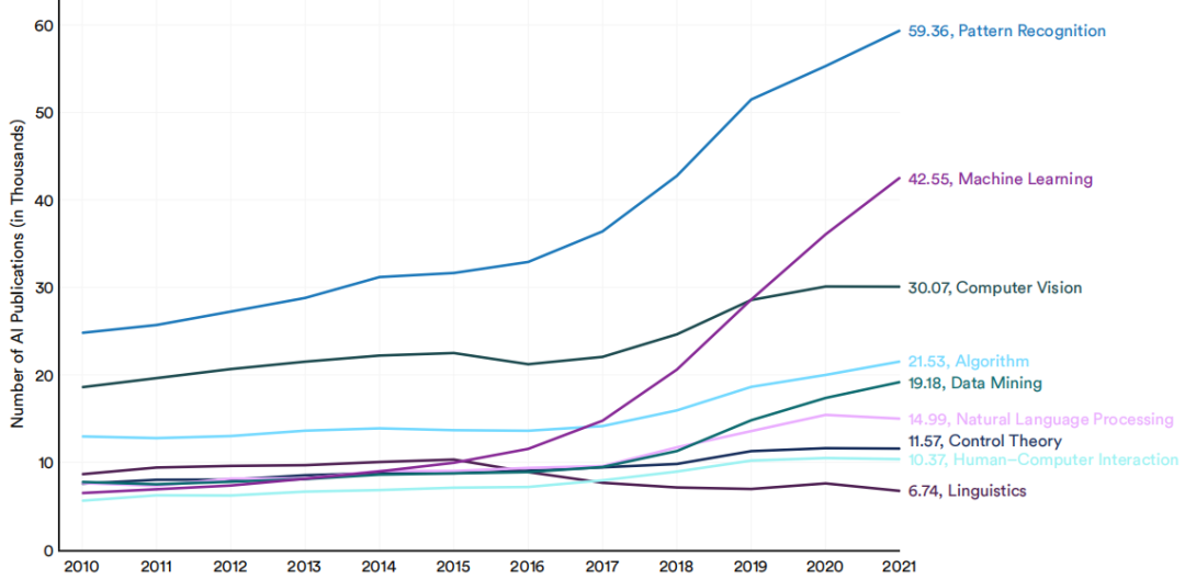 按研究领域分类-人工智能出版物数量(不包括其他人工智能),2010-21年资料来源:美国安全与新兴技术中心,2022年|图表:2023年人工智能指数报告。