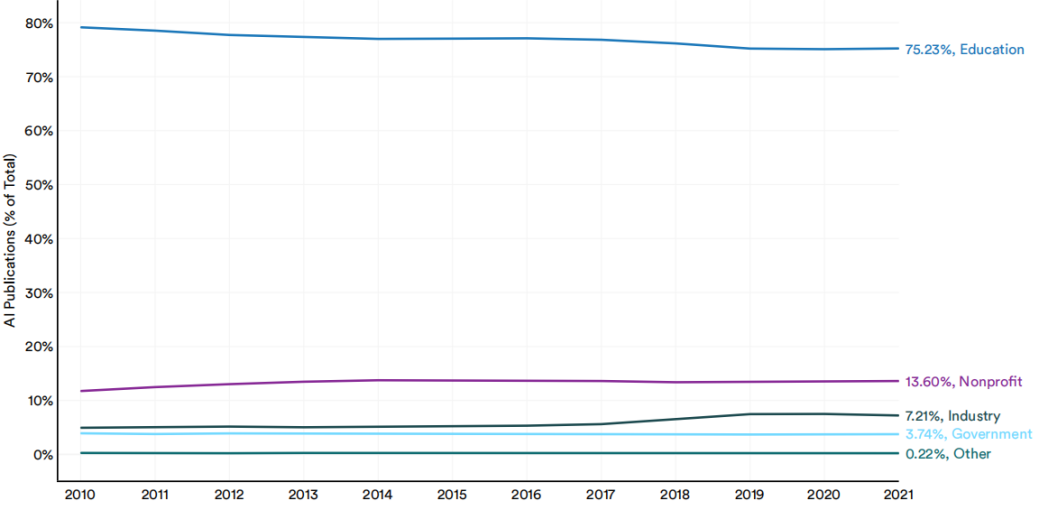 2010-2021年按各部门划分的人工智能出版物(占总数的%)