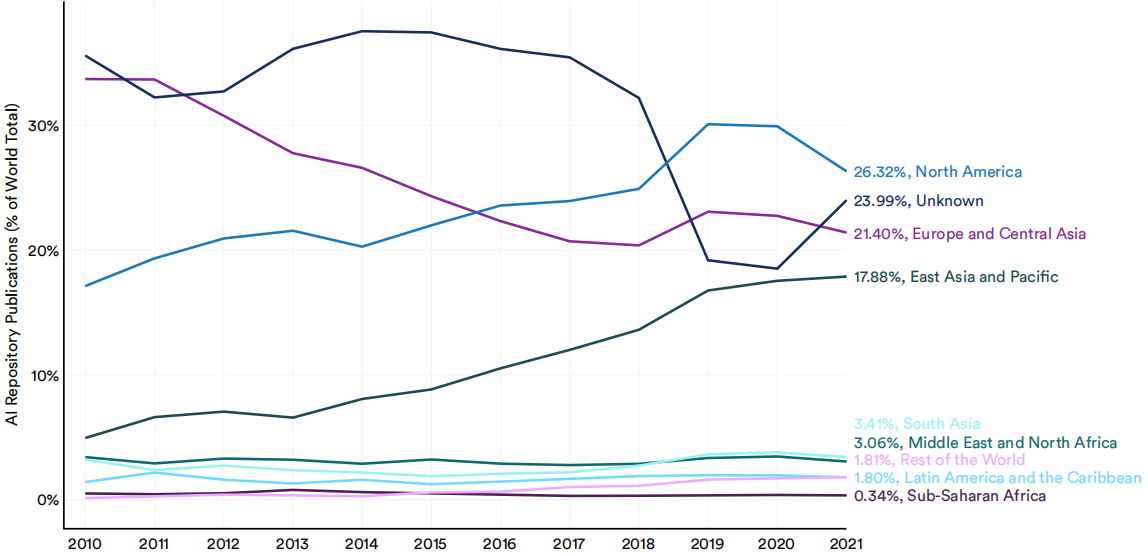 图1.1.18显示,自2016年以来,北美地区在全球人工智能存储库出版物的市场份额上一直保持着稳定的领先地位。自2011年以来,来自欧洲和中亚的知识库出版物的份额有所下降。自2010年以来,东亚和太平洋地区所代表的份额显著增长,并从2020年至2021年继续增长,在这期间,北美以及欧洲和中亚资料库出版物的份额同比下降。