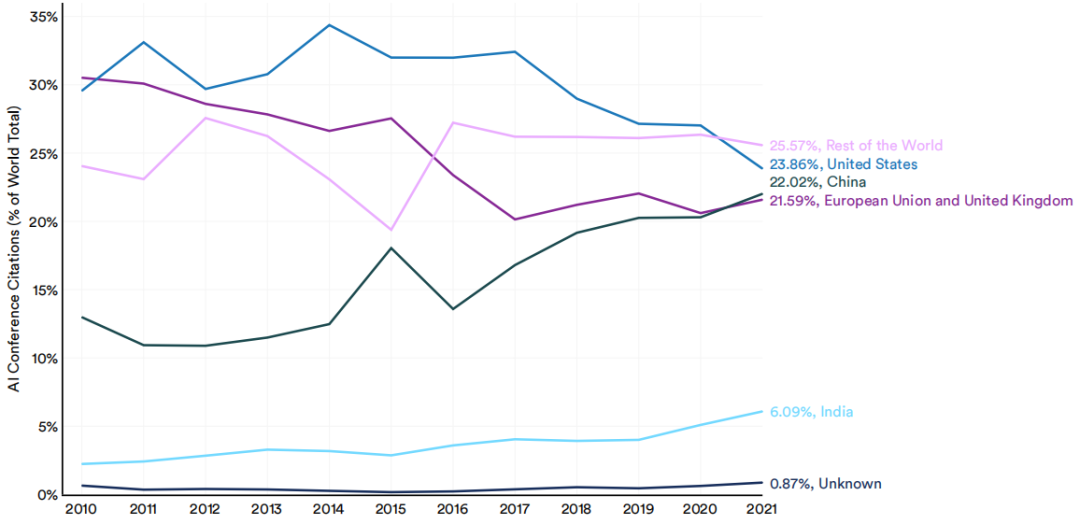 2010-21年按地理区域划分的人工智能会议引用量(占世界总数的%)