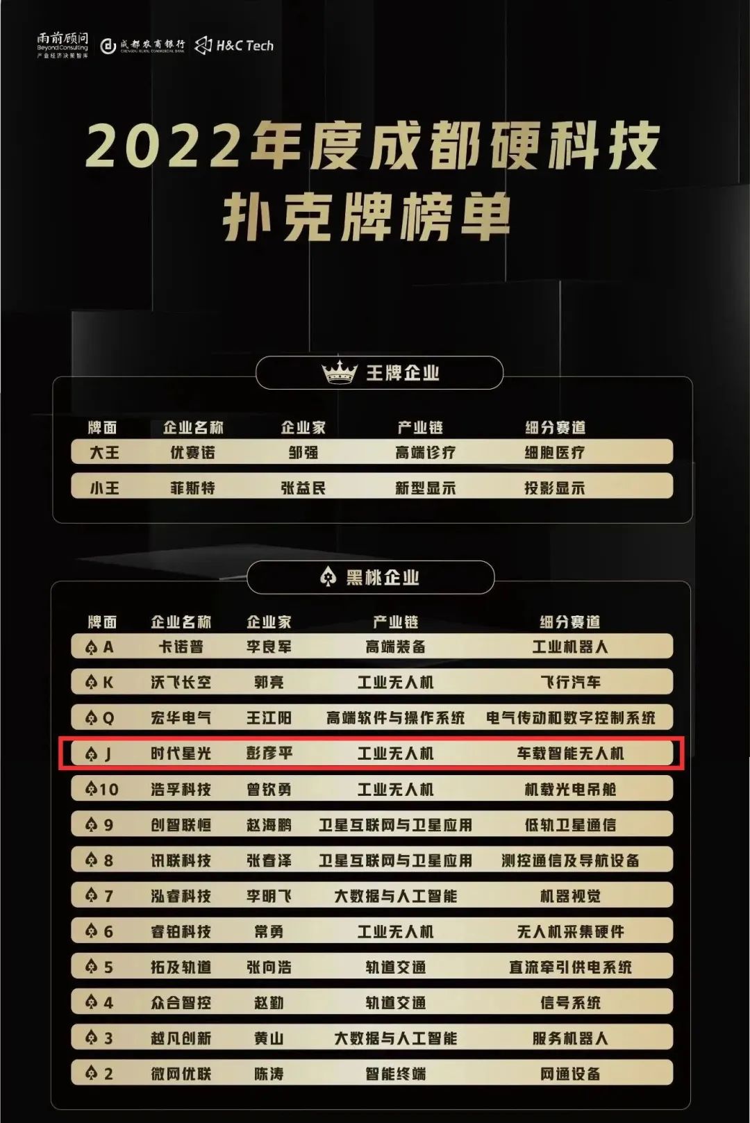 年会重磅发布“2022成都硬科技扑克牌”榜单,本届榜单评选打破了历届评选企业数量记录,竞争极为激烈。时代星光凭借在车载智能无人机领域硬核的核心技术、优越的产品性能、持续增长的实力,登榜“2022成都硬科技扑克牌——黑桃J”。