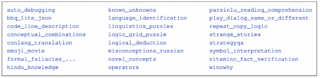 为了更好地挑战能力日益强大的大型语言模型,一个由来自132个机构的442名作者组成的团队推出了超越模仿游戏基准测试(“BIG-bench”)。该基准测试包括204个任务,这些任务的范围包括语言学、儿童发展、数学、常识性推理、生物学、物理学、社会偏见和软件开发。