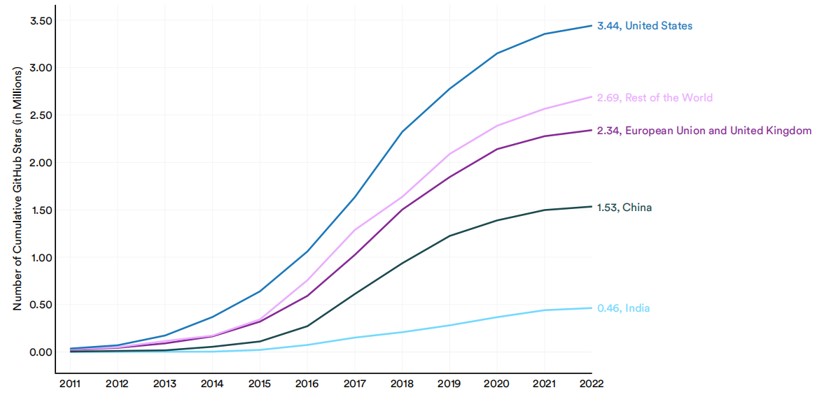 GitHub用户可以通过“主演”它来收藏或保存一个感兴趣的存储库。GitHub的明星类似于社交媒体平台上的“点赞”,表示对某个开源项目的支持。一些最突出的GitHub存储库包括张量流、OpenCV、Keras和PyTorch等库,这些库被AI编码社区的软件开发人员广泛使用。图1.4.3显示了属于不同地理区域所有者的项目的累计星数。截至2022年,来自美国的GitHub AI项目获得的星数最多,其次是欧盟和英国,然后是中国。在许多地理区域,新出现的GitHub恒星的总数在过去几年中已经趋于稳定。