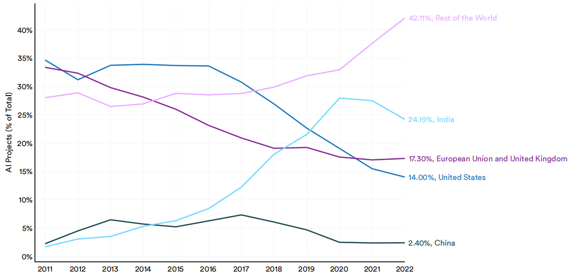 2011-22年GitHub AI项目(总%)按地理区域划分
