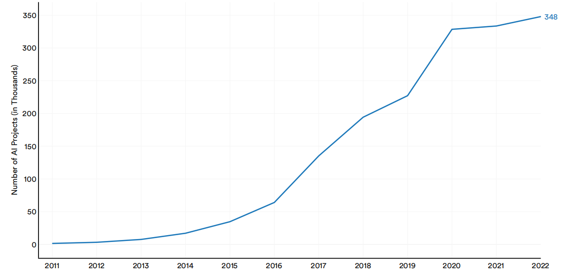GitHub 项目是文件的集合,可以包括构成软件项目的源代码、文档、配置文件和图像。 自 2011 年以来,与人工智能相关的 GitHub 项目总数稳步增长,从 2011 年的 1,536 个增长到 2022 年的 347,934 个。
