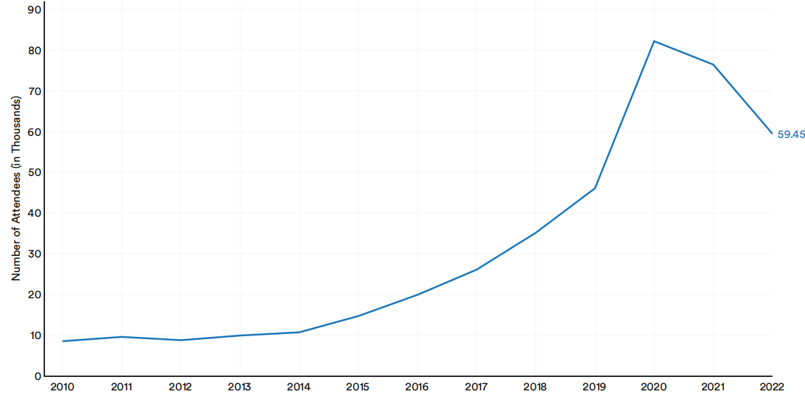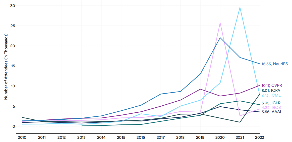 经过一段时间的出席人数增加后,AIIndex 收集数据的会议的总出席人数在 2021 年和 2022 年再次下降(图 1.3.1)。这种下降可能是由于许多会议在之后恢复了混合或面对面的形式。 2020年和2021年完全虚拟。例如,国际人工智能联合会议(IJCAI)和国际知识表示与推理原则会议(KR)均严格以现场形式举行。神经信息处理系统(NeurIPS)仍然是其中之一 参加人数最多的会议,约有 15,530 人参加(图 1.3.2)。参加人数一年增幅最大的会议是国际机器人与自动化大会 (ICRA),从 2021 年的 1,000 人增加到 2022 年的 8,008 人。