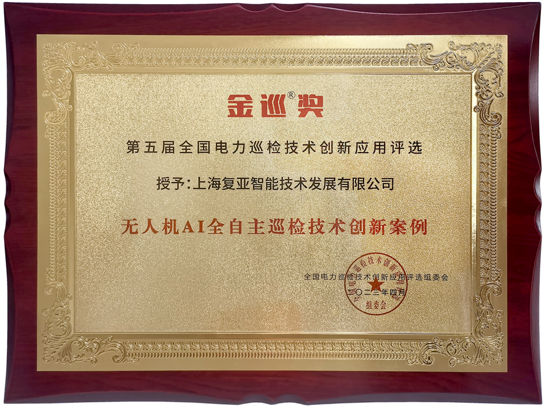 在本届「金巡奖」第5届全国电力巡检技术创新应用评选中,复亚智能荣获“无人机AI全自主巡检技术创新案例奖”。