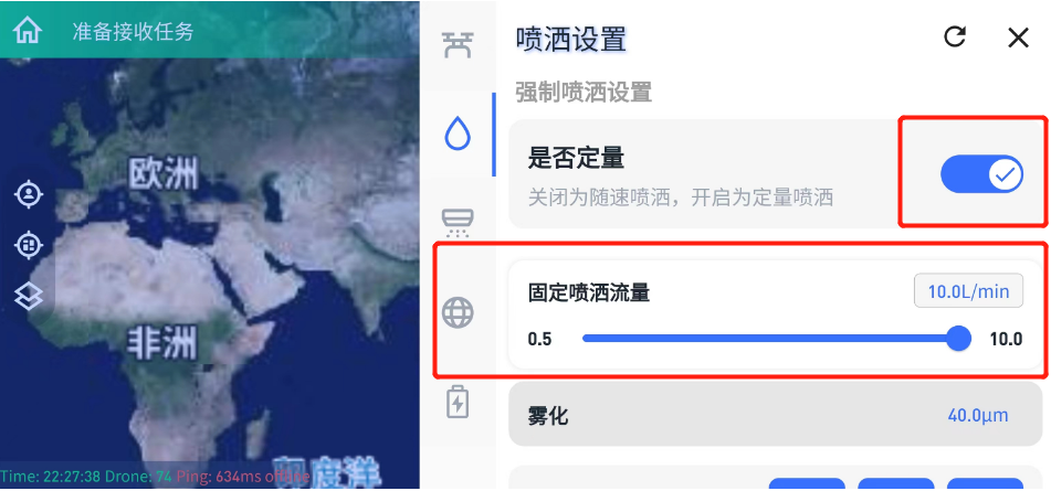喷洒和播撒均支持设置定量喷洒/播撒值。仅支持EA-30X、EA-30XP无人机,30X需升级至1.2.19固件,30XP需升级至1.4.6固件。
