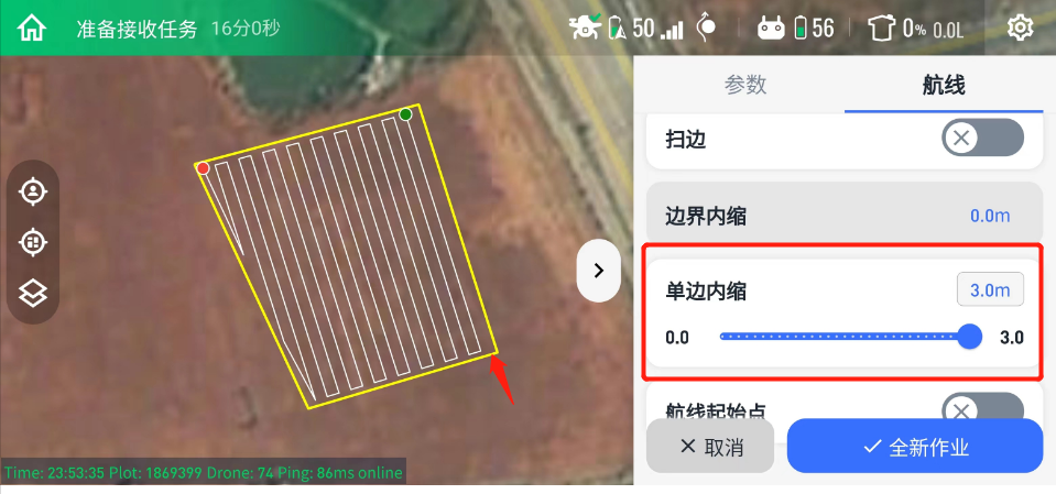 注意单边内缩需要先选择内缩的参考边,一旦使用了航线旋转设定,单边内缩将自动取消。