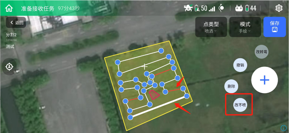 点击不需要喷洒的航线,点击改不喷,此段航线将变为红色,作业时将不再喷洒。便于一些条带种植场景,中间夹带一些不需要喷洒的航线,此功能仅适用于手绘航线。