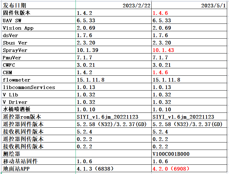 【注意】使用1.4.6无人机固件需配合4.2.0以上版本地面站,请同时升级地面站APP;升级前请确认当前固件版本号以及各模块版本号,以下附上历史各版本主要模块版本号,方便大家进行查阅。