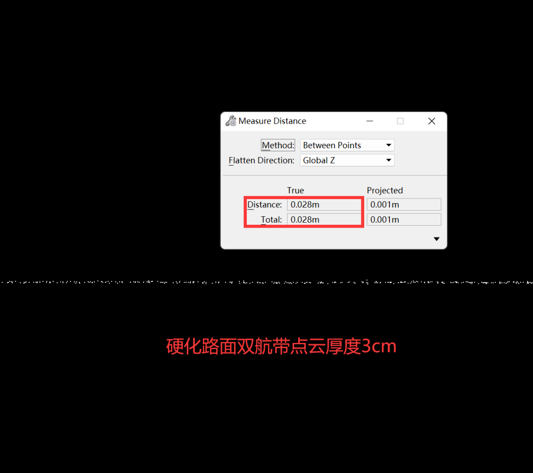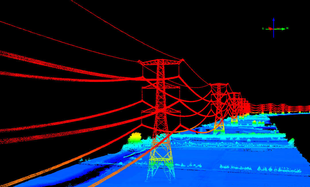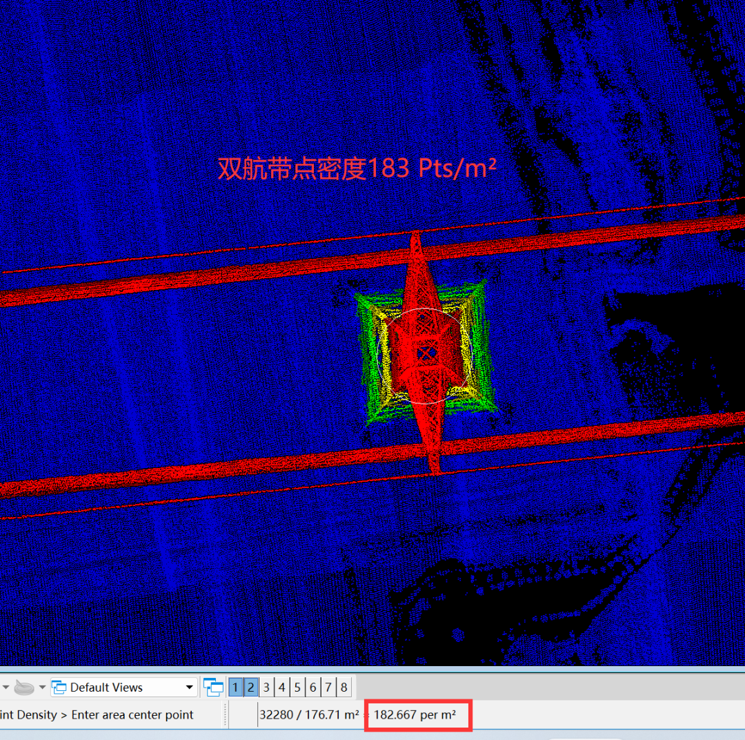 通过双航带数据对比分析,电塔和电力线无重影,吻合效果好;点云厚度<5cm,高程精度高;点云密度>100点每平米,满足巡检规范要求。