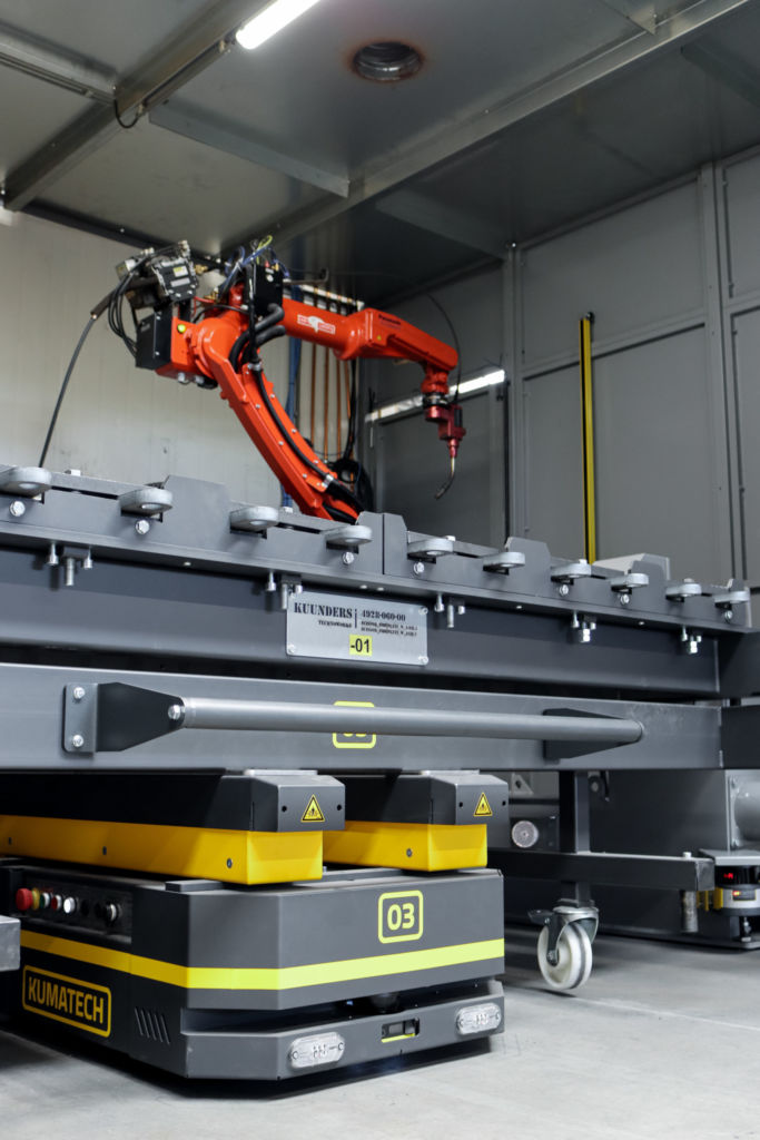 “我们就我们想到的概念与几个方面进行了接触。AGV 的 Kuunders 和焊接机器人的 Valk Welding 受到质疑。双方之前曾合作过,并愿意与我们一起制定解决方案。此外,两家供应商在软件开发方面都处于领先地位,因此他们可以为机器人提供正确的程序以及要焊接的产品。我们自己负责 ERP 和 TMS(Kuunders 的运输管理系统)之间的通信,它定义了需要焊接的位置和优先级。Valk Welding 提供了我们可以用来创建焊接程序 (DTPS)、自动搜索和缩放它们 (QPT) 的软件工具,以及车间控制软件 (SFC)。”