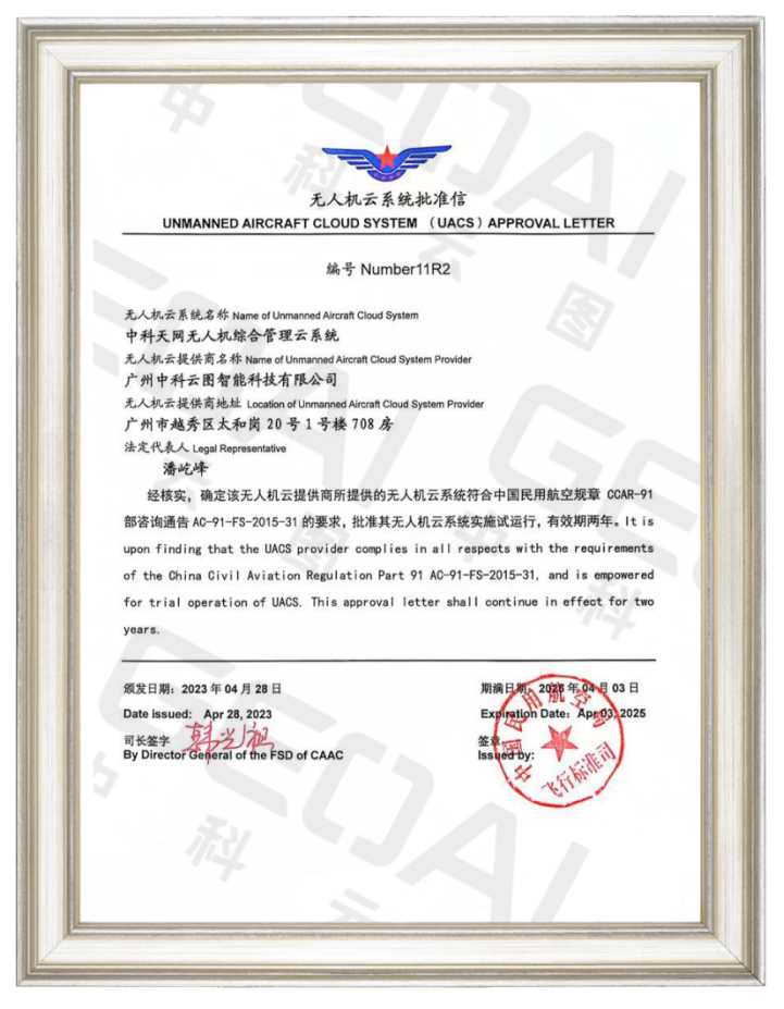 2023年4月28日,中科云图收获一则振奋人心的佳讯:参与改版研制并独家运营的“中科天网”无人机综合管理云系统(以下简称“中科天网”),再次获得中国民航局飞行标准司颁发运行批准信(编号Number11R2)。