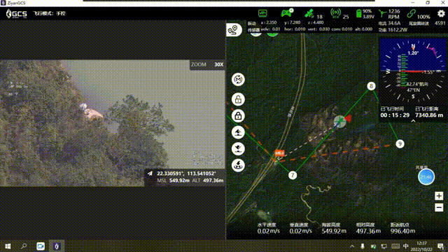以珠海市某山林发生山火为例,在此次的应急森防救援行动中,紫燕团队在接到当地相关部门要求参与山火救援需求后,立即着手准备车辆和无人机设备赶赴火灾现场,并根据相关部门指令,采用无人直升机搭载可见光/红外双光吊舱,在火场高空执行火势、火情侦察任务,将火场画面实时回传至指挥中心,为指挥决策提供有力参考,同时紫燕也根据实际情况挂载灭火弹协同消防人员参与扑救。