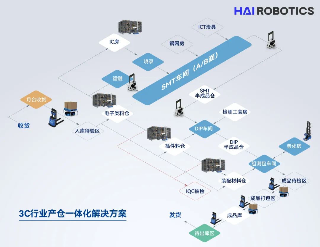 3C行业产仓一体化解决方案是海柔创新专为3C行业客户打造的,集拣选、搬运、自动上下料场景的一体化解决方案,将助力3C制造业客户完成原材料仓储、半成品仓储、成品仓储、工装治具仓储等拣选业务流程,同时实现拣选完成物料的产线配送、产线间的物料流转及自动上下料。该解决方案由A42系列箱式仓储机器人、A3系列托举式机器人、潜伏式顶升AMR、HaiQ智慧仓储管理平台等软硬件产品构成。
