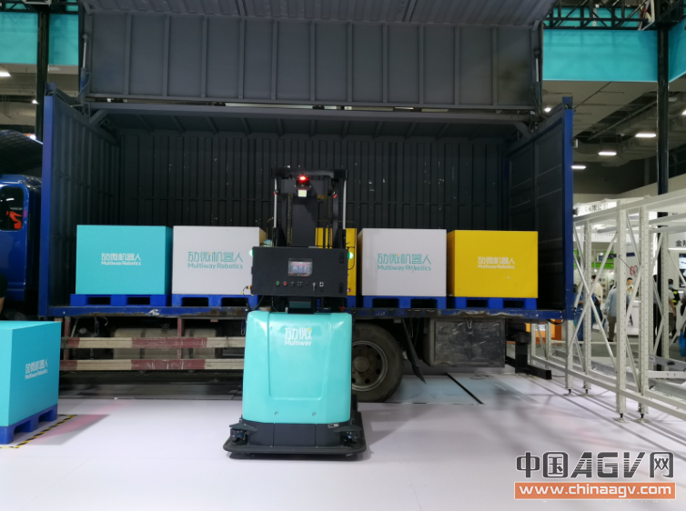 图:平衡重式无人叉车MW-SE15现场演示飞翼车无人装卸场景