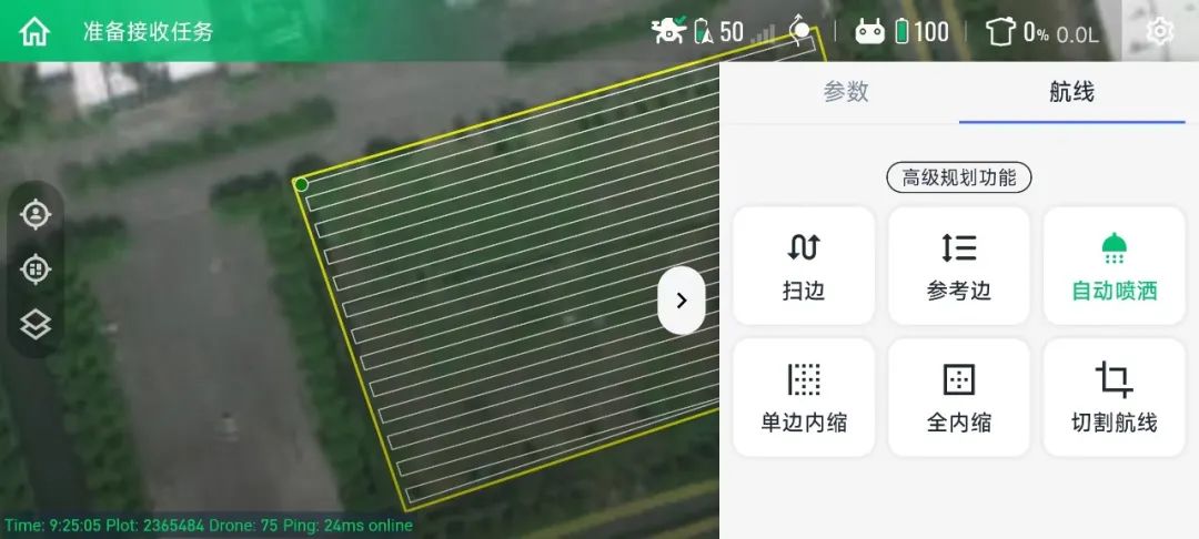 针对需要固定流速或播撒开度进行作业的场景,可打开定量喷洒开关,此时无人机将不再根据速度进行流量或播撒量的调节,始终按照设定的固定流速值与播撒开度进行作业,需注意正常精准喷洒不要打开此功能,避免作业亩用量出现偏差,影响施药效果。