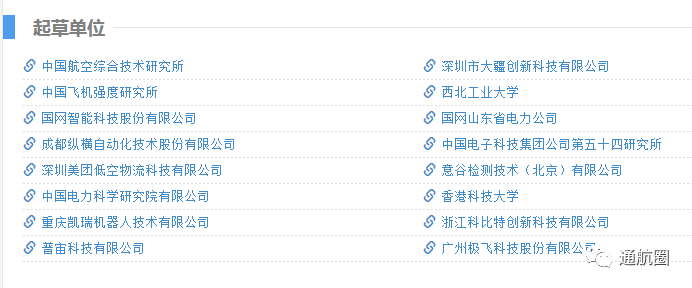 据通航圈了解,国家标准《民用无人驾驶航空器系统安全要求》 由工业和信息化部归口,委托全国航空器标准化技术委员会执行 。主要起草单位包括中国航空综合技术研究所、深圳市大疆创新科技有限公司、中国飞机强度研究所、西北工业大学、国网智能科技股份有限公司 、国网山东省电力公司 、成都纵横自动化技术股份有限公司 、中国电子科技集团公司第五十四研究所 、深圳美团低空物流科技有限公司、意谷检测技术(北京)有限公司 、中国电力科学研究院有限公司 、香港科技大学 、重庆凯瑞机器人技术有限公司 、浙江科比特创新科技有限公司 、普宙科技有限公司 、广州极飞科技股份有限公司。