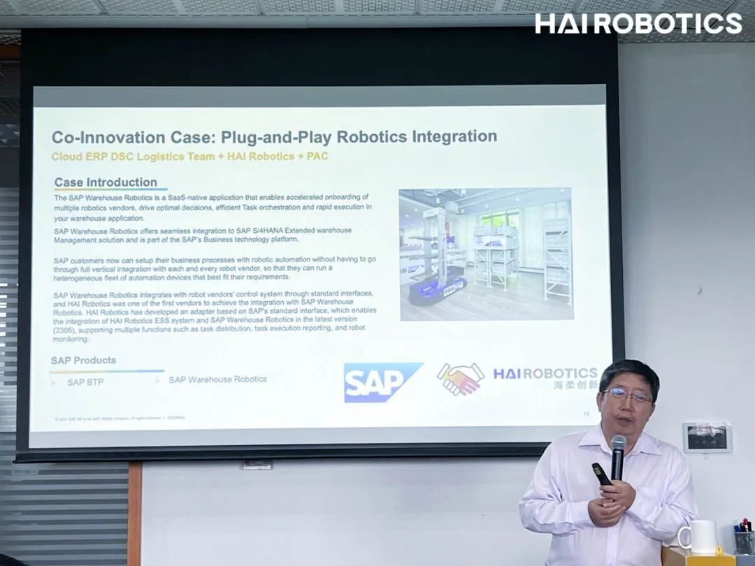 6月6日,SAP联合创新中心合作伙伴沙龙会在上海举行。SAP中国研究院院长李瑞成博士,现场介绍了海柔ACR机器人和SAP系统的解决方案,可帮助客户建立更有韧性的供应链。